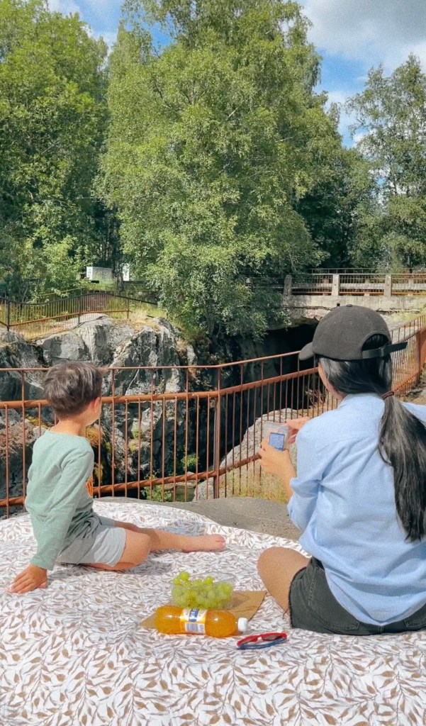 Thác nước của Phần Lan nhỏ xíu vậy chứ người ta kéo nhau đến xem và chụp hình nhiều lắm. Tụi mình thì cũng kéo nhau đi xem và đem theo chút đồ ăn thay đổi không khí.