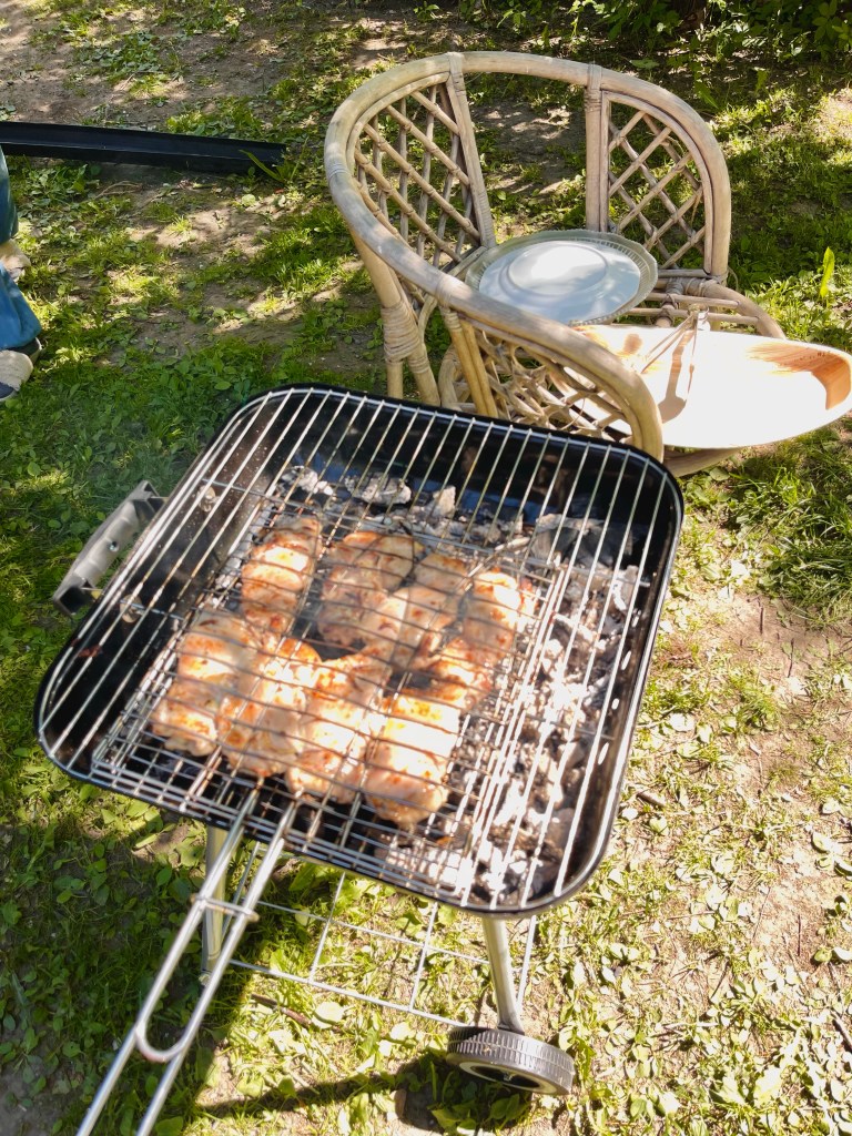 Thường thì bên này việc nướng thịt là việc của đàn ông, có lúc họ sẽ tự ướp thịt rồi, bỏ than và nướng. Trong nhà mình thì mama hay là người ướp thịt. Khâu ướp thịt của mama cực kỳ đơn giản, chỉ là cắt ít hành tây, một ít muối, tiêu và giấm rồi trộn lên và để đó cho ngấm. Vậy thôi chứ vị ăn cũng cực kỳ ngon. Mỗi mùa hè mama hay trồng rất nhiều hành và cây thì là. Mama của mình là người gốc Phần, sinh ra và lớn lên ở Nga nên là bà ấy cũng coi mình là người Nga. Ông bà ngoại của chồng là người Phần, nói tiếng Phần. Ông còn là cựu chiến binh của Phần Lan nữa. Mama phải tới 7 tuổi đi học ở Nga mới bắt đầu nói tiếng Nga, mà giờ thì tiếng Nga chuẩn hơn cả tiếng Phần. À quay lại chuyện nướng thịt. Ý mình muốn kể lý do tại sao mama lại thích ăn thì là nhiều như người Nga như vậy. Sau khi cắt xong một mớ hành tươi thì tụi mình rửa khoai tây. Mùa hè bên Phần có món khoai tây non, củ khoai tây nhỏ và người Phần hay ăn luôn vỏ. Còn papa và mama thì ăn gọt vỏ quen rồi nên trước khi đem nấu thì mình phải rửa và chải cho lớp vỏ non bóc hết cả ra. Sau khi bắt khoai tây luộc lên bếp luộc thì cũng là lúc bà chị họ của chồng mình cũng cắt dưa leo và cà chua đồ xong.