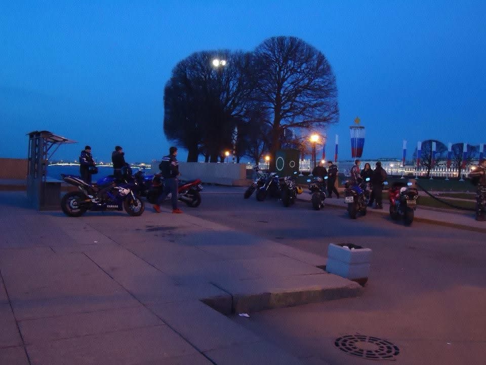 Bữa đó nhỏ bạn mặc áo khoác đỏ tai gấu, mấy bạn Nga thích màu mè ngồi trên bờ, xin chụp hình chung với gấu đỏ. Chúng tôi đến nơi lúc còn rất sớm. Trời bắt đầu lạnh hơn. Chúng tôi tiếp tục băng qua phía Cung Điện để đi dạo cho đỡ lạnh. Xong đi mãi đi mãi thế nào lại đi đến chỗ “Cột Đỏ” ở góc trên bên trái và “Nhà của Thần Biển”. Tôi không biết chỗ đó gọi là gì nên tự đặt theo ý mình. Trong hình có “Cột Đỏ” và “Nhà của Thần Biển” phía bên góc phải tấm hình. Còn nhớ dưới chân cột đỏ có cái “chòi” cafe, tôi từng đứng đó, lạnh run, mắt thèm thuồng nhìn về phía đó. Lúc đó mọi người đang dọn hàng, tôi thèm biết bao ly ca cao hay tách cà phê nóng. Ở gần đó, một lúc sau có một đoàn thanh niên cả nam lẫn nữ đi xe moto, nhìn ai cũng cao ráo xinh đẹp, mặc đồ đen như chuẩn bị đua xe, nhỏ bạn kêu tôi lại xin họ chụp một tấm hình.