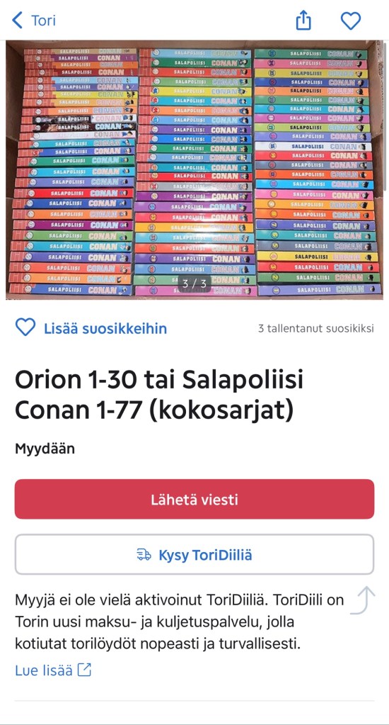 Tình cờ thấy cuốn truyện tranh Conan ở thư viện làm bao ký ức ngày xưa ùa về. Mới đầu tôi cũng không tính đọc, nhưng vì đọc và lại bị cuốn theo cốt truyện, tôi lại tự cho mình một lý do “đọc truyện để có thể học thêm ngôn ngữ giao tiếp tiếng Phần Lan” như vậy là có ích. Càng đọc thì lại càng muốn sở hữu cả bộ truyện. Ước mơ ngày xưa lại trở lại mạnh mẽ. Ngày đó không có tiền nên không thể mua được cả bộ truyện chỉ biết nhìn và ao ước. Mấy hôm trước tôi lên chợ cũ phát hiện có người bán cả bộ truyện bằng tiếng Phần Lan không sót quyển nào thì đã không biết bao nhiêu lần muốn nhắn tin hỏi mua.